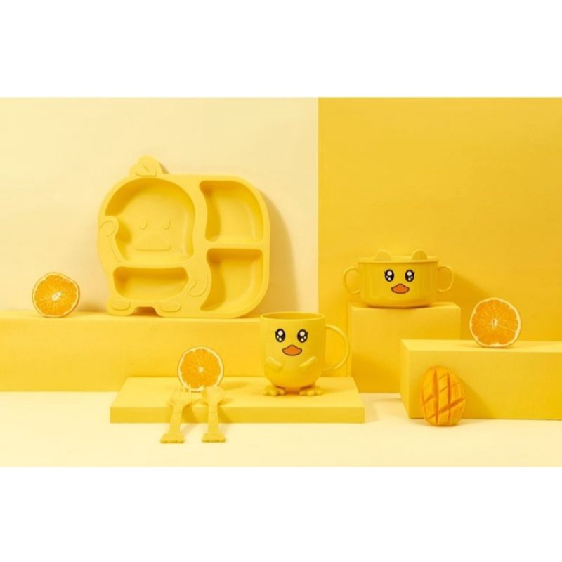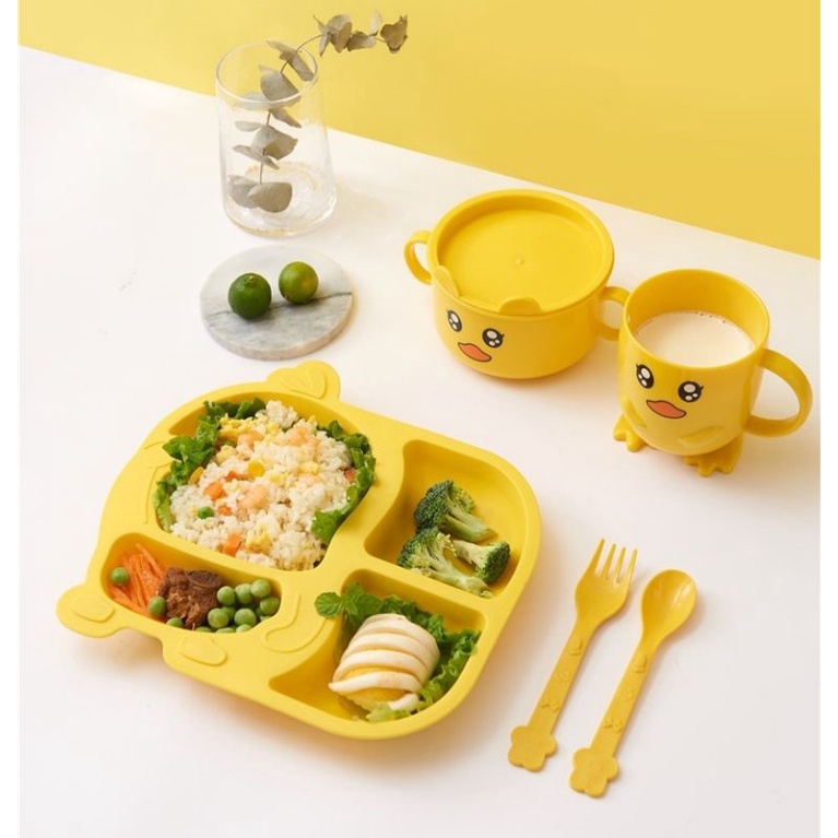 Harga 5pcs Set Peralatan Makan Anak Bebek Kuning Desain 3Dimensi Piring Mangkuk Gelas Sendok Garpu